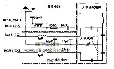 RFID系統(tǒng)中,射頻基站芯片(如MF RC531)通過天線發(fā)射能量,并與電子標簽進行數(shù)據(jù)通信。天線的設(shè)計對通信的穩(wěn)定性非常重要,本設(shè)計采用直接匹配天線法,電路設(shè)計如圖3所示。