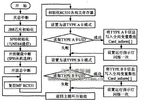 系統(tǒng)上電后首先執(zhí)行MCU 以及相關(guān)模塊的初始化操作,然后進入主循環(huán)。如圖4所示,主循環(huán)中不斷地切換讀卡模式,以滿足讀取TYPE A & B兩種電子標簽UID的需求。一旦讀取成功,將UID賦給全局字節(jié)型數(shù)組變量Card_inform[]。Card_inform[0]存放電子標簽的類型,即“A”或“B”的ASCII碼,其后依次存放該類型的UID。主控系統(tǒng)可以通過讀寫模塊硬件中間件的SPI通信接口獲取Card inform[]中的內(nèi)容,獲取完畢后JB8將Card_inform[]數(shù)組清零。對RC531的復位和寄存器初始化操作原本放置在主循環(huán)之前,即每次JB8復位后只執(zhí)行一次。但是在實際測試過程中,當RC53l長時間運行后會出現(xiàn)不穩(wěn)定的情況,因此將這兩步操作放在主循環(huán)中,以提高系統(tǒng)的魯棒性。