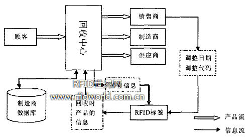 統(tǒng)網(wǎng)絡(luò)發(fā)送至制造商數(shù)據(jù)庫(kù)。當(dāng)產(chǎn)品通過(guò)回收中心修復(fù)處理,再由銷售商二次銷售時(shí),銷售商將調(diào)整產(chǎn)品RFID上的相關(guān)Et期及客戶代碼。同時(shí)向數(shù)據(jù)庫(kù)上傳信息。
