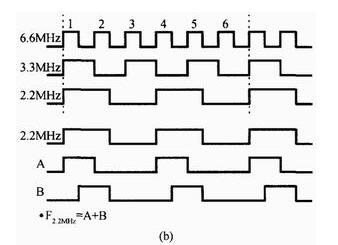 振蕩器必須提供兩種頻率:2.2MHz(用以反射數據“0”以及做時鐘校正)和3.3MHz(用以反射數據“1”)。因此片內振蕩器的輸出頻率為616MHz,二分頻之后為3.3MHz,三分頻之后為2.2MHz,另外,6.6MHz的時鐘還可以給標簽內部的EEPROM電荷泵提供時鐘。其中,反射調制的時鐘占空比為約50%。