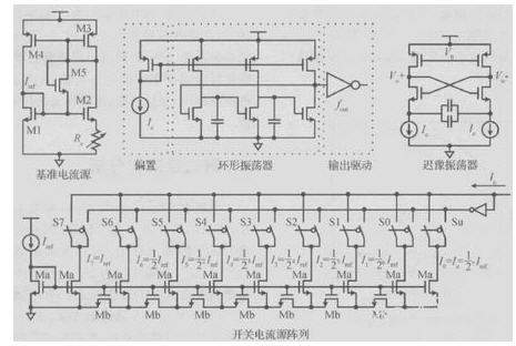 調節電流的開關電流源陣列用于產生二進制權電流[5,6]。選取電流分割比例為2,因此晶體管Mb的寬長比是晶體管Ma的兩倍。由于最小的電流值比較小并基于晶體管匹配方面的考慮,晶體管Mb的寬和長分別為4和2μm。數字信號的開關則對每個權電流選通,選通的權電流相加后就是振蕩器的偏置電流。這種權電流分隔技術的優點是面積很小,精度較高,避免了過多晶體管導致的寄生電容過高等不利因素,大大節省了芯片面積。振蕩器采用環形振蕩器和弛豫振蕩器兩種方案。其中環形振蕩器的輸出頻率為