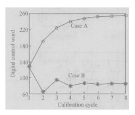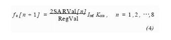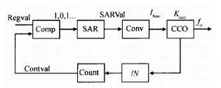 利用以上的參數,參考相關的鎖相環理論[7],建立了環路模型,如圖4所示。其中RegVal是SAR改變取值的閾值,Comp是比較模塊,SAR是逐次逼近寄存器,Conv是數字控制字到偏置電流的變換,Ibias是用于控制振蕩器頻率的偏置電流,Kcco是振蕩器的電流控制增益。計數器對N分頻以后的頻率進行計數,然后和RegVal進行比較。當每一個數字校準周期到來時,振蕩器的輸出頻率為