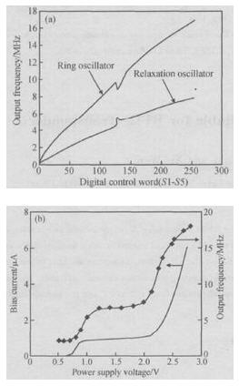 (b)環形振蕩器輸出頻率、偏置電流和電源電壓的關系