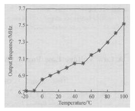 由于條件的限制,這里僅給出了環振的溫度仿真結果,如圖8所示。仿真結果表明振蕩器能在-20~100℃的溫度范圍內工作,得到的輸出頻率溫度敏感度約為617kHz/℃。由溫度引起的頻率偏差能夠由數字校準很快校準回來。