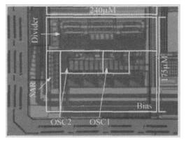 圖9是芯片的照片,不包括Pad時,振蕩器的面積約為240μm×175μm。