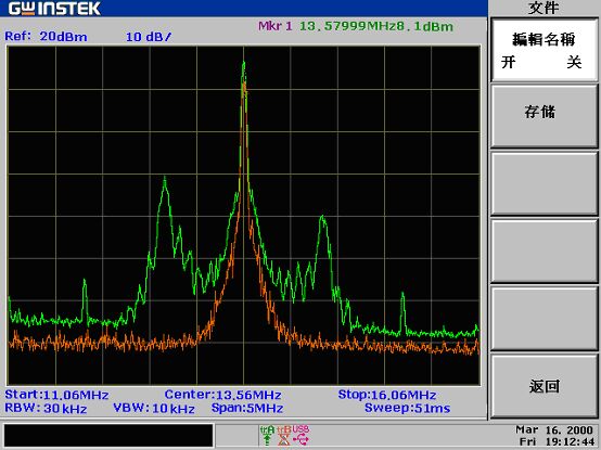設置GSP-830中心測量頻率為13.56MHz,Span 5MHz,參考電平20dBm,RBW自動(30KHz),游標1打開,Trace B實時更新,限制線關閉。