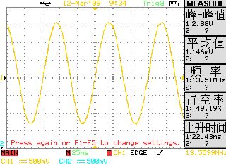 當讀卡器上不放置二代身份證卡片(讀卡器不讀卡)時,讀卡器持續向空間發射13.56MHz,功率15dBm的RF信號,如圖3紅色曲線所示。該RF信號也可用示波器觀察到,如圖4所示。