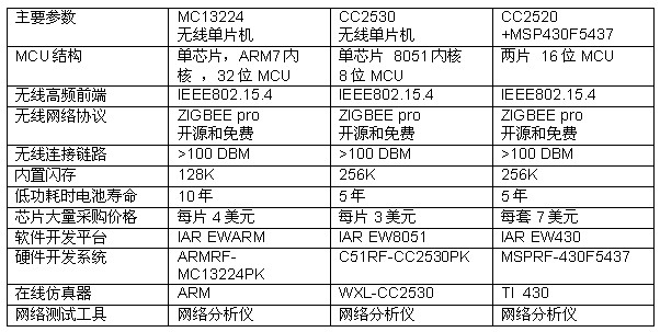 目前TI公司和FREESCALE公司推出的3套最新無線單片機解決方案:MC13224, CC2530, MSP430F5437+CC2520, 都是很好的SoC 微控制器解決方案,(見表一) 這些方案的特點是,高度集成化設計,微處理器和無線收發(fā)部分在同一芯片內(nèi)部,需要電路板面積小于2平方厘米,外圍只小于很少零件,就有很強抗干擾能力。工業(yè)無線傳感器網(wǎng)絡的網(wǎng)關,路由器和傳感器節(jié)點,都可以使用同一微處理器來設計;
