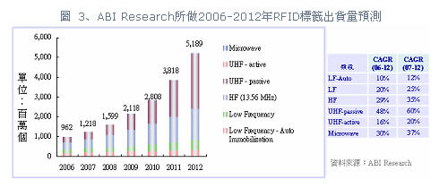 圖3、ABI Research所做2006-2012年RFID標簽出貨量預測