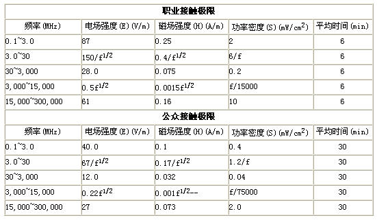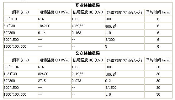 接觸極限:表示人體承受電磁輻射空間彌漫的最大強度,即功率密度。常用單位有:μW/cm2、mW/cm2、W/m2。功率密度與場強的關系為:S=E×H,其中S為電磁輻射空中傳輸功率密度,E為電場強度(V/m),H為強場強度(A/m)。真空中E/H=377Ω。