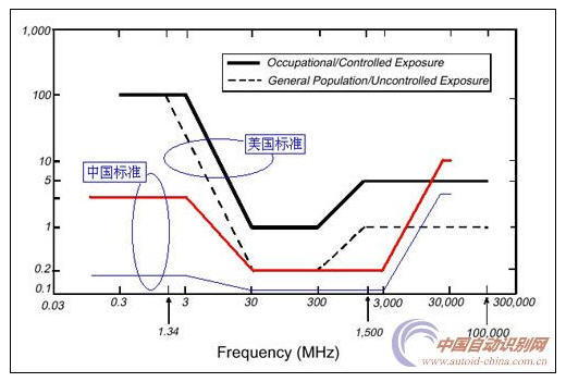UHF頻段無源RFID系統(tǒng)應用中,相關的電磁輻射的數(shù)量級與移動通信手機(移動通信基站的輻射功率相對較大從幾瓦至幾十瓦不等)的電磁輻射強度相當。適當保持與RFID讀寫器天線的距離30cm~60cm即可符合國外與國內的安全限值標準(不會對人體產(chǎn)生不良影響)。無源RFID系統(tǒng)工作時,讀寫器需要發(fā)射較大的射頻功率且有可能通過天線的增益作用在特定方向上形成較強的電磁輻射。分析計算表明,針對UHF頻段的無源RFID系統(tǒng),只要保持離開讀寫器天線一定距離(半米左右),人體所承受的電磁輻射則完全在電磁輻射標準所規(guī)定的安全限值范圍之內。