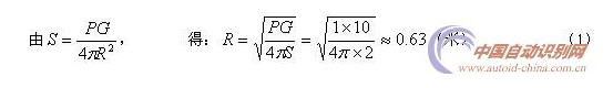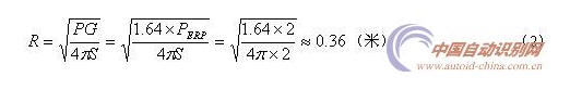 如果考慮到國內信產(chǎn)部發(fā)布的“800/900MHz頻段射頻識別(RFID)應用試行規(guī)定”的有效輻射功率限制為PERP=2W,重新計算的安全距離為0.36米(如果按美國RFID應用規(guī)定的輻射功率PEIRP=PG=4W計算,得到的結果為0.18米),如下式(2)。