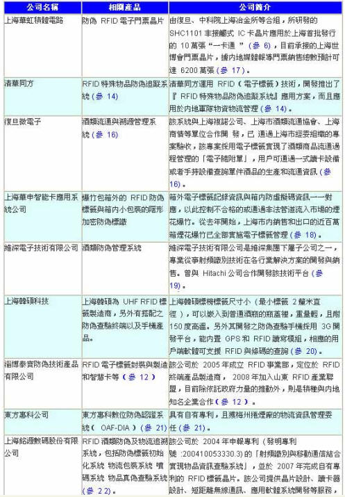 表1 、內地高價值商品防偽之技術廠商與產品匯總簡表