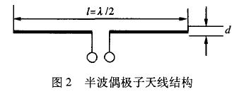 半波偶極子天線的長度是半個波長,它的結構如圖2所示。由于半波偶極子是基本的線天線,很多天線都是在半波振子的基礎上設計的。