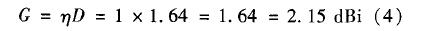 由于半波偶極子的特性阻抗接近純阻性,因此可以把半波偶極子看作無耗天線,即η=1。由于半波偶極子的方向系數D=1.64,因此半波偶極子的增益為: