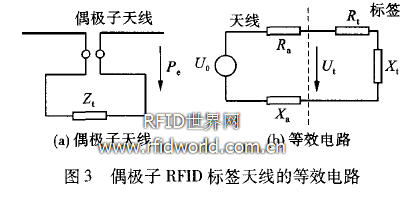 偶極子RFID標簽天線的等效電路如圖3所示,如果RFID標簽在閱讀器周圍的一定范圍內,假設 為標簽天線在電場強度為E,距離為r的區域所產生的感應電壓,而傳送至RFID標簽終端的電壓U1只是U0 的一部分。由圖3可看出U1,為RFID標簽的供電電壓。