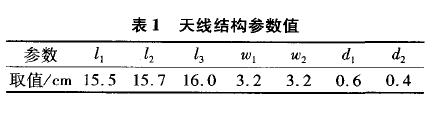 從式(10)可看出,該結構由若干參數決定,如偶極子寬度d1和d2,每根偶極子之間的距離W1和W2 。這些參數值直接影響天線輻射電阻值,為使標簽達到最大效率,表1給出了RFID系統應用頻率在868~915 MHz的天線結構參數值。