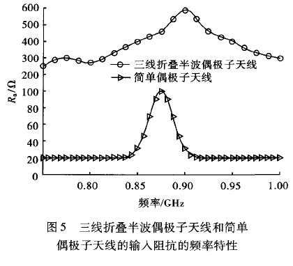 該結構中,每根偶極子之間的寬度d應小于0.05λ。這種天線結構使得天線的輻射電阻能夠達到簡單半波偶極子的8倍左右,其輻射電阻值可由式(10)得到:
