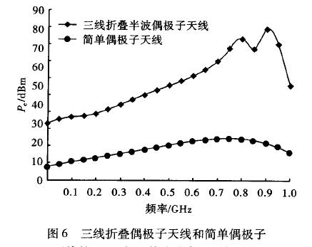 圖5給出了三線折疊半波偶極子天線和簡單偶極子天線阻抗隨頻率變化的情況,可以看出,該結構的天線阻抗明顯比簡單偶極子高了很多,能夠較好地與RFID標簽芯片達到阻抗匹配。圖6給出了應用該三線折疊偶極子天線及簡單偶極子天線的RFID標簽接收功率隨頻率的變化情況,可以看出,三線折疊偶極子天線結構使RFID標簽的功率接收效率有了明顯提高。