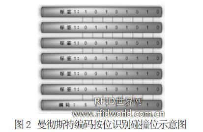 二進(jìn)制搜索算法, 是以一個(gè)獨(dú)特的序列號(hào)(UID)來(lái)識(shí)別標(biāo)簽為基礎(chǔ)的, 為了能辨認(rèn)出閱讀器中數(shù)據(jù)碰撞比特位的準(zhǔn)確位置, 傳統(tǒng)采用曼徹斯特編碼。該編碼采用電平的上升沿和下降沿來(lái)表示數(shù)值位。本文中假設(shè)上升沿編碼為邏輯“0”, 下降沿編碼為邏輯“1”, 若狀態(tài)跳變, 視為無(wú)效數(shù)據(jù)且作為錯(cuò)誤碼被識(shí)別。如在多標(biāo)簽的環(huán)境中當(dāng)同時(shí)有上升沿和下降沿同時(shí)存在是, 則會(huì)互相抵消從而無(wú)狀態(tài)跳變, 以此閱讀器判斷發(fā)生碰撞的準(zhǔn)確位數(shù)而再次搜索。假設(shè)有6 個(gè)RFID 標(biāo)簽, 其相應(yīng)EPC代碼為8 位, 利用曼徹斯特編碼能準(zhǔn)確識(shí)別出碰撞位的示意圖如圖2 所示, 圖中用紅色部分為碰撞位。