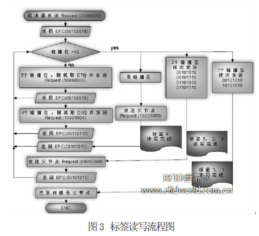 Step5: 閱讀器發(fā)送Request(00000000)命令。區(qū)域內(nèi)所有處于非“啞吧” 狀態(tài)的標(biāo)簽應(yīng)答, 即標(biāo)簽1 與標(biāo)簽3 應(yīng)答, 同理可解碼得EPC數(shù)據(jù)為: $0101010, 此時(shí)碰撞位只有D7 位。則讀寫(xiě)器可依次通過(guò)SELECT命令發(fā)送00101010, 10101010, 從而完成標(biāo)簽3 和標(biāo)簽1 的讀寫(xiě)操作, 最后通過(guò)UNSELECT 命令將標(biāo)簽3 和標(biāo)簽1 置于“休閑” 狀態(tài)。算法再采用回溯策略, 從該節(jié)點(diǎn)的父節(jié)點(diǎn)獲得下一次Request 命令所需的參數(shù), 由于已到樹(shù)根無(wú)父節(jié)點(diǎn), 因此識(shí)別過(guò)程結(jié)束。圖3 為識(shí)別讀寫(xiě)全部標(biāo)簽的流程圖: