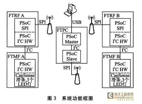 由于CyFi使用的是星型廣播式網(wǎng)絡(luò)協(xié)議,所有消息需要經(jīng)過中心Hub,故實現(xiàn)節(jié)點A到節(jié)點B數(shù)據(jù)通信的過程如下:節(jié)點A通過I2C協(xié)議采集多功能板A的CapSense觸摸滑塊的位置、3個LED燈的亮滅情況等數(shù)據(jù),并與目標(biāo)節(jié)點B的ID號一起通過RF發(fā)送出去;Hub檢測到網(wǎng)絡(luò)中有消息后,再根據(jù)消息中的目標(biāo)節(jié)點ID將消息轉(zhuǎn)發(fā)出去,同時將數(shù)據(jù)保存到緩存中等待PC機讀取;節(jié)點B接收到消息之后根據(jù)消息中的數(shù)據(jù),同樣通過I2C協(xié)議控制多功能板B上的3個LED燈的亮滅。其中Hub所在設(shè)備FTPC有2個PSoC內(nèi)核:主內(nèi)核實現(xiàn)USB—I2C轉(zhuǎn)換和各個板卡(包括從內(nèi)核)的編程功能;從內(nèi)核實現(xiàn)Hub功能,同時通過I2C與主內(nèi)核連接。系統(tǒng)功能框圖如圖3所示。