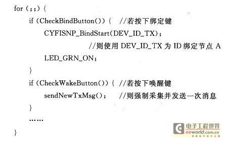 CY3271套件的光盤中提供了各個PSoC的設(shè)計樣例,本文中PSoC部分的設(shè)計就是在這些樣例的基礎(chǔ)上修改而成的。為了實現(xiàn)上述功能,需要在節(jié)點A發(fā)送的消息中添加目的節(jié)點B的ID信息,以便Hub將接收到的消息再轉(zhuǎn)發(fā)出去。每個CyFi收發(fā)器有2種ID;一種為6字節(jié)的Radio ID,此ID在收發(fā)器出廠時燒入,不可更改且全球唯一;另一種為1字節(jié)的Node ID,此ID在節(jié)點綁定時確定,可以事先指定也可以由Hub動態(tài)分配。由于Ra-dio ID較復(fù)雜,開發(fā)人員在開發(fā)過程中可以忽略RadioID,而只關(guān)注Node ID。