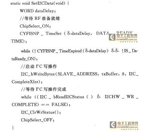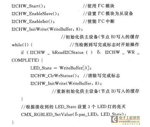 其中,負(fù)責(zé)接收消息并且控制多功能板B的函數(shù)receiveNewRxMsg()中必須與節(jié)點A對應(yīng)的將消息類型修改為CYFISNP_API_TYPE_CONF_BCDR,且在其中調(diào)用的SetI2CData()函數(shù)如下: