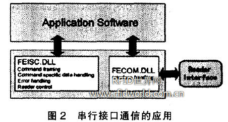 本文使用兩種方法與閱讀器通信。一種是客戶端計(jì)算機(jī)上帶有$6500閱讀器的應(yīng)用軟件通過連接本地動(dòng)態(tài)鏈接庫來通信。TI提供程序庫feisc.dll和fecom.du。如圖2。