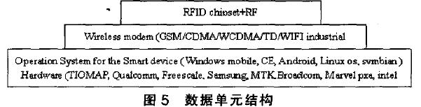 通過這3個(gè)單元,將RFID智能設(shè)備整合在智能終端上。其中可以選擇的平臺(tái)包括Windows Mobile,Windows Pocket PC(windows CE),Android OS,Linux OS。智能設(shè)備將按照系統(tǒng)管理中心提供的數(shù)據(jù)指令,完成數(shù)據(jù)的采集和實(shí)時(shí)更新。數(shù)據(jù)單元結(jié)構(gòu)如圖5。