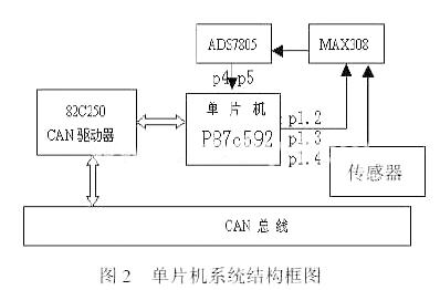 傳感器采用磁場(chǎng)三分量測(cè)量模塊,電場(chǎng)三分量測(cè)量模塊,傾角2分量測(cè)量模塊。信號(hào)處理電路中將各信號(hào)進(jìn)行放大和濾波,放大采用兩片LM148四運(yùn)放,濾波器是由運(yùn)算放大器構(gòu)成的兩個(gè)有源低通濾波二階節(jié)的級(jí)聯(lián)。單片機(jī)系統(tǒng)將電場(chǎng)三分量信號(hào)、磁場(chǎng)三分量信號(hào)和兩個(gè)姿態(tài)角信號(hào)共8路信號(hào)輪流選通送入A/D進(jìn)行轉(zhuǎn)換,A/D轉(zhuǎn)換選用B-B公司生產(chǎn)的16位芯片ADS7805,其輸入電壓范圍為±10V,輸出16位和8位可選,這里使用16位并行輸出,其控制信號(hào)由單片機(jī)的口線P1.0、P1.1和P1.2產(chǎn)生,單片機(jī)系統(tǒng)的結(jié)構(gòu)框圖如圖2所示。單片機(jī)采用PHILIPS的是有再片CAN功能的微控制器P87C592,晶振頻率為16MHz, P0口和P2口用作數(shù)據(jù)線和地址線,P4口和P5口用作16位模數(shù)轉(zhuǎn)換器的高8位和低8位并行數(shù)據(jù)線。P1.6、P1.7用于CAN總線,P1.2、P1.3和P1.4控制八選一多路轉(zhuǎn)換器MAX308的通道。PC82C250為CAN總線收發(fā)器,是CAN控制器和物理總線間的接口,提供對(duì)總線的驅(qū)動(dòng)發(fā)送能力 、對(duì)CAN控制器的差動(dòng)發(fā)送能力和對(duì)CAN控制器的差動(dòng)接收能力。它有很強(qiáng)的抗瞬間干擾和保 護(hù)總線的能力;有3種不同的工作方式即高速、斜率控制和待機(jī)。總線上的某節(jié)點(diǎn)掉電不會(huì) 影響總線,在40 m內(nèi)實(shí)現(xiàn)高速應(yīng)用可達(dá)1 Mbps。主機(jī)接收端使用PCL-841 ,PCL-841可直接插在計(jì)算機(jī)的ISA擴(kuò)展槽內(nèi),計(jì)算機(jī)為PCL-841分配內(nèi)存地址,并將其作為標(biāo)準(zhǔn)內(nèi)存進(jìn)行讀寫,內(nèi)存地址可通過(guò)跳線設(shè)置為C800H至EF00H中40個(gè)基地址中的任一個(gè)。是內(nèi)置CAN控制器的CAN總線通信卡,它提供總線仲裁和錯(cuò)誤檢測(cè)并自動(dòng)重發(fā)送功能,從而避免了數(shù)據(jù)丟失,保證了系統(tǒng)的可靠性。