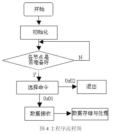 主機(jī)程序包括測(cè)量和控制子程序、通信子程序、數(shù)據(jù)處理子程序等。數(shù)據(jù)測(cè)量和控制子程序用來(lái)控制下位機(jī)進(jìn)行測(cè)量,通信子程序根據(jù)通信協(xié)議發(fā)送控制命令并接收測(cè)量數(shù)據(jù),數(shù)據(jù)處理子程序?qū)崿F(xiàn)對(duì)數(shù)據(jù)的預(yù)處理和存儲(chǔ)。主機(jī)程序用C語(yǔ)言編寫。主機(jī)程序流程見圖4。