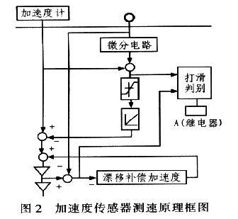 輪軸脈沖轉(zhuǎn)速傳感器也存在一定缺陷:即車輪空轉(zhuǎn)或打滑會(huì)使列車速度的測(cè)量結(jié)果存在誤差,為解決此類問(wèn)題,在列車車軸上加裝一個(gè)加速度傳感器,配合脈沖轉(zhuǎn)速傳感器使用。該方式工作原理:在列車打滑期間,把機(jī)車的內(nèi)加速度作為測(cè)速的信息源,該信息與車輪旋轉(zhuǎn)的狀態(tài)等信息不相關(guān),而在其余工作時(shí)間仍用輪軸脈沖傳感器測(cè)速,所以該方式稱為基于慣性加速度傳感器的測(cè)速。在車輪打滑時(shí),由加速度傳感器測(cè)得加速度及車輪打滑前加速度的傾斜分量,而計(jì)算出車輪打滑時(shí)的列車運(yùn)行加速度,再將該值積分即得車輪打滑時(shí)列車實(shí)時(shí)運(yùn)行的速度。具體原理如圖2所示。