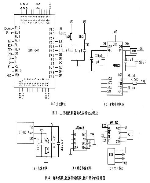 (2)射頻收發(fā)模塊選用RMU900超高頻讀寫模塊。該模塊通過天線解調(diào)、解碼射頻標(biāo)簽發(fā)射的信號,把數(shù)據(jù)發(fā)送給主控器件實(shí)現(xiàn)數(shù)據(jù)的采集,或?qū)⒚詈蛿?shù)據(jù)編碼、調(diào)制后經(jīng)天線發(fā)送給標(biāo)簽,實(shí)現(xiàn)對標(biāo)簽的寫操作。數(shù)據(jù)的傳輸通過與C8051F340的串口O相連的TX0和RX0實(shí)現(xiàn)。圖3為主控模板和射頻收發(fā)模塊原理圖。