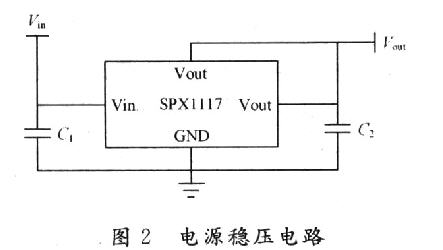 由于核電站的特殊性,對于某些部位的取電很方便,因此采取雙節點的方法,即信號采集節點與匯聚節點Ⅲ。節點的設計如圖1所示,由傳感器、微處理單元、通信模塊、電源模塊組成。信號采集節點用普通高能干電池供電,而匯聚節點則采用干電池與220 V雙電源設計方案(如圖2所示),220 V的電壓經過低壓變壓器降壓至5 V左右,整流后輸入到Vin,經過SPX1117穩壓電路以后,就可以在Vout輸出3.3 V的穩壓電。這樣的話,可以大大增強匯聚節點的運算能力,最大限度地延長網絡的工作時間。同樣信號采集節點的干電池也可以采用這種穩壓方式。