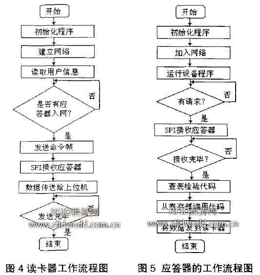 讀卡器是整個無線網絡的管理員,它將負責網絡的建立、地址的分配和成員的加入、節點設備數據的更新、設備關聯表的維護并根據網絡的狀況自動更新。ZigBee網絡要求至少一個FFD作為網絡主節點。要建立一個網絡,第一個節點必須被配置成主節點,這樣才能管理以后添加到網絡的其它節點。由于主節點處于網絡的最上層,功能復雜,因此時主節點的硬件配置也有較高的要求,主節點一般是由電源供電。本課題中讀卡器相當于整個網絡的主節點,而應答器作為終端節點。一旦主設備將節點設備同網絡連接,便可以實現通信。圖4為在網絡建立成功的基礎上讀卡器的工作流程圖。