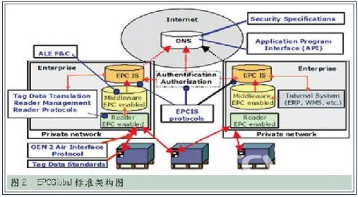 EPCglobal提出了Auto-ID系統的五大技術組成,分別是EPC(電子產品碼)標簽、RFID標簽閱讀器、ALE中間件實現信息的過濾和采集、EPCIS信息服務系統,以及信息發現服務(包括ONS和PML)。由于從一開始就讓世界各大洲的從業人員充分參與,EPCGlobal標準(架構圖如下)得到了較廣泛認同,這里不再對其標準體系架構贅述。