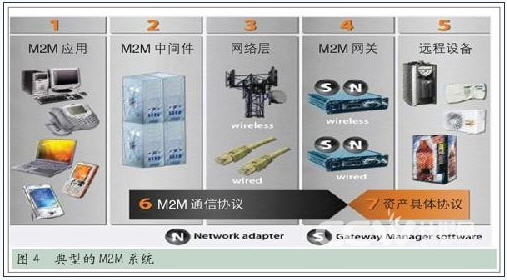 業界認同的M2M理念和技術架構覆蓋的范圍應該是最廣泛的,包含了EPCGlobal和WSN的部分內容,也覆蓋了有線和無線兩種通信方式,一個典型的M2M系統由圖4所示的幾個部分組成。
