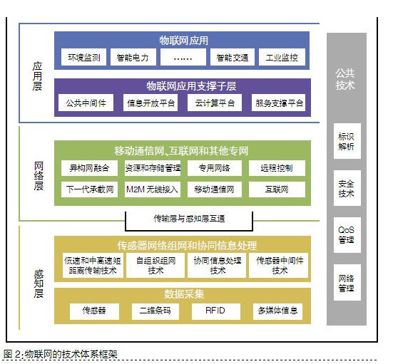 物聯網的技術體系框架如圖2所示,它包括感知層技術、網絡層技術、應用層技術和公共技術。
