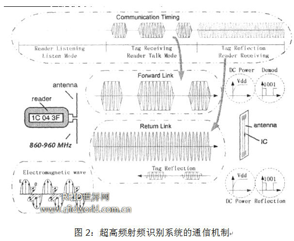 由圖1所示,射頻識別系統的主要內容包括閱讀器和電子標簽兩個部分,兩者之間是在閱讀器和電子標簽的天線以及無線信道中建立通信的。圖2是射頻識別系統的工作機制,閱讀器和電子標簽之間通過電磁波進行通信,通信的時序大體上可以分為三個階段:閱讀器的偵聽模式,閱讀器到標簽的通信,標簽到閱讀器的通信。閱讀器的偵聽模式是閱讀器先在某個工作信道上偵聽是否有其他閱讀器在工作,假如沒有其他閱讀器占用該信道,則閱讀器發送一個指令給標簽,然后發送一個無調制的載波,此時標簽反射這個無調制的載波,從而把信息發送給閱讀器。閱讀器與標簽之間主要為兩個通信過程:第一個通信過程是閱讀器發送一個調制的載波給標簽,如OOK,此時電子標簽從電磁波中獲取能量,并解調閱讀器發射的信號,得到閱讀器的指令;第二個過程是標簽獲得閱讀器的指令以后,根據指令的內容,經過標簽內閱讀器狀態機的轉換,把標簽的內容通過后向散射(Backscatter )的方式傳輸給閱讀器,而此時閱讀器發送無調制的載波用以提供標簽工作需要的能量,以及標簽反射需要的電磁波載體。