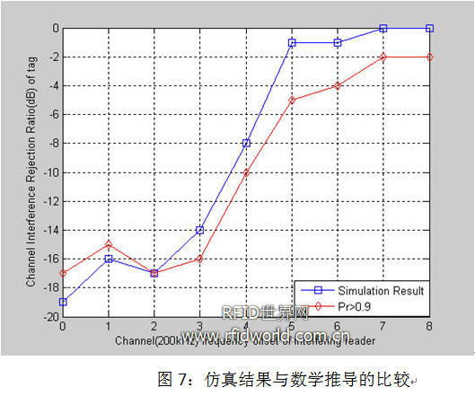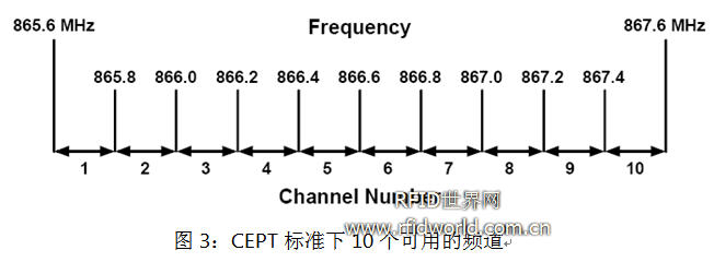 Reader可以工作在多個信道上,圖3是CEPT標準下10個可用的信道。圖4是工作在某個信道上的reader對相鄰信道和其它的干擾情況。由此,我們可以得出,通過信道劃分可以使多個reader同時正常工作。所以,Signal-to-Interference Ratio(SIR)的門限值不會產生Reader-to-Tag干擾或Reader-to-Reader干擾成為我們研究的重點。