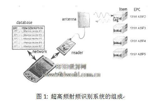 射頻識別(RFID)技術是一種自動識別技術,己經有幾十年的歷史了,并被廣泛應用于動物識別、鐵路車皮識別、自動高速公路收費、航空行李處理、資產跟蹤、公共交通等[1]。MIT的Auto-ID中心提出了產品電子編碼(EPC)的概念[2],把類似于條形碼編碼的產品電子編碼(EPC)存儲在電子標簽(Tag, or Transponder)中,電子標簽貼在物體上,閱讀器(Reader, or Interrogator)通過電磁波從讀出編碼,通過這種方式可以識別物體。圖1是超高頻射頻識別系統的組成,電子標簽貼在物品表面,閱讀器和標簽之間通過電磁波進行通信,閱讀器獲取的EPC編碼傳輸到主機中,從而識別物品。當電子標簽的成本很低時,可以取代條形碼。