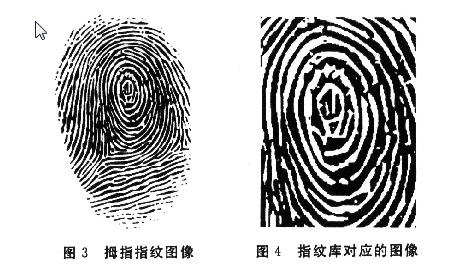 采用The MathWoks公司的MATLAB7.O圖像處理箱進行數(shù)據仿真,計算機配置CPU為INTEL公司2.06 GZH,內存為Kingston公司的1GZH,平均一幅圖像數(shù)據仿真耗時為O.73秒。識別率誤差小于1/310 000,完全實際符合要求。圖3為隨機的一幅拇指指紋圖像,圖4為指紋庫采集對應的圖像。