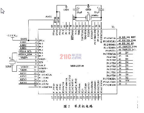 本系統(tǒng)的控制電路采用MSP430F149單片機(jī),MSP430F149共有五種低功耗模式,即低功耗模式O(LPMO)至低功耗模式4(LPM4),非常適合手持設(shè)備的低功耗要求,具體電路如圖2所示。由圖2可看出,單片機(jī)的P1.O,P1.1,P1.2,P1.3作為通用I/O口接鍵盤,P4口和P3.5,P3.6,P3.7分別作為L(zhǎng)CD液晶顯示器的數(shù)據(jù)與控制連接端口;單片機(jī)的P5.1,P5.2接TMS275溫度傳感器芯片,P5.2,P5.3,P5.4接DSl302芯片引腳,P6.6和P6.7接AT24C16芯片引腳,三個(gè)芯片都使用軟件模擬I2C總線協(xié)議,P6.3和P6.4接LED起指示作用。