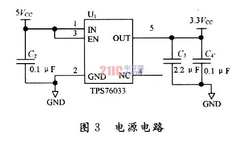 由于MSP430系列單片機(jī)的工作電壓一般是l.8~3.6 V,并且功耗極低,因此選用TI公司的TPS70633作為電源芯片。該電源芯片輸出為3.3 V,電流為50 mA,完全能滿足大多數(shù)低功耗應(yīng)用場(chǎng)合的要求。圖3為具體電路,由圖3可以看出:該電路非常的簡(jiǎn)單,只需要簡(jiǎn)單的外圍器件。為了使輸出電源的紋波小,在輸出部分用了一個(gè)2.2μF和0.1μF的電容,另外在芯片的輸入端也放置一個(gè)2.2μF的濾波電容,進(jìn)一步減小干擾。
