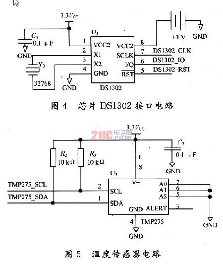 系統(tǒng)采用的溫度傳感器為TI公司的TMP275,圖5為溫度傳感器電路,該器件的主要特性包括:50μA功耗、9~12 b可編程分辨率、O.1μA關(guān)機(jī)電流模式、整個(gè)溫度范圍內(nèi)出色的穩(wěn)定性以及-40~+125℃的廣泛工作溫度范圍。該器件還允許多達(dá)8個(gè)不同地址,以實(shí)現(xiàn)接口總線設(shè)計(jì)的高靈活性,電路中.AO,A1,A2接地用于決定芯片的器件地址。溫度傳感器TMP275可直接輸出數(shù)字信號(hào),而無(wú)需對(duì)采樣信號(hào)作信號(hào)調(diào)理和信號(hào)的模數(shù)轉(zhuǎn)換,可以直接傳輸給單片機(jī)信號(hào)處理系統(tǒng),測(cè)溫精度±0.5℃。TMP275兩線串行接口(引腳SDL,SDA)與I2C總線接口兼容,可直接與其相連。