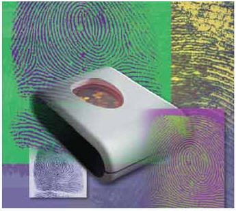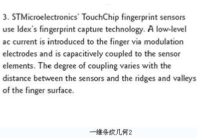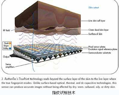 AuthenTec公司的AES2810低功耗指紋認證傳感器適合于筆記本電腦。據該公司稱,其第一顆單芯片傳感器集成了基于RF的專利傳感器、硬件安全模塊以及匹配引擎,該引擎可以執行128位加密和解密。操作基于AuthenTec的TruePrint表面下指紋識別技術,該技術可以在各種條件下讀取任何人的指紋圖(圖2)。