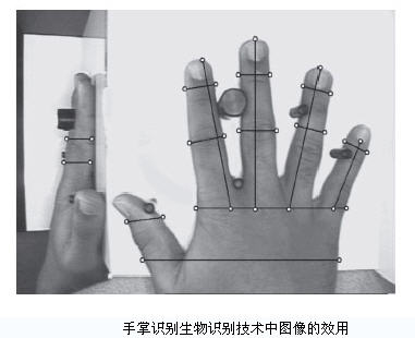 密歇根州立大學的研究人員正在研究在手掌識別生物識別技術中圖像的效用。圖像采集系統包括了一個光源、一個照相機、一面單一的鏡子和一個其上具有5顆釘子的平面(圖5)。