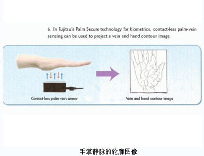 日立公司開發了用于門把手的手柄式手指靜脈認證技術,實現了安全門禁控制。Techsphere還提供了用于安全訪問控制的手掌血管圖形識別生物識別技術。富士通成立了非接觸式手掌靜脈識別部門,該部分識別獨特的手掌靜脈的輪廓圖像(圖6)。此外,Identica公司的血管圖形掃描儀掃描一個人手背皮膚下面的靜脈。