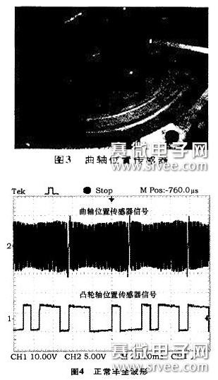 故障分析與測試采用雙蹤示波器同時測量故障車上曲軸位置傳感器與凸輪軸位置傳感器的波形如圖1所示,在同類型的正常車上測得的凸輪軸位置傳感器和曲軸位置傳感器波形如圖2所示。